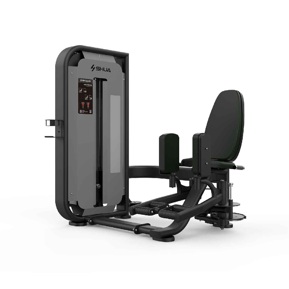 主要功能 锻炼大腿内外侧肌、臀部肌肉1、阻力形式:配重块;总重90kg;最小调节重量5kg2、垫类(坐/背/胸/肘垫):PU泡成型3、最大人体承重:150kg4、主要管材规格:龙门架平椭150502.0mm,副架平椭120502.0mm5、牵索形式:日本进口钢丝绳;¢5.6mm6、轴承:人本轴承;6205;60047、滑轮:尼龙加纤;¢117mm8、皮革